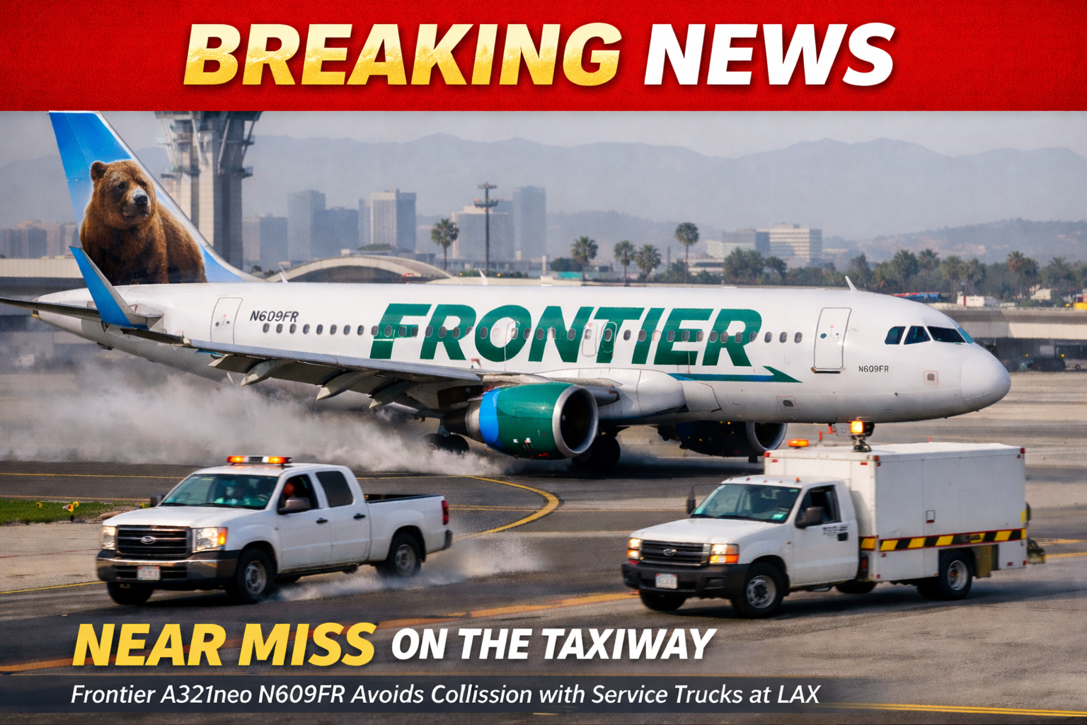 A Frontier Airlines Airbus A321neo, registered N609FR, narrowly avoided a serious ground collision at Los Angeles International Airport after two airport service trucks unexpectedly crossed its taxi path. The incident occurred while the aircraft was taxiing for departure, with passengers and crew on board preparing for takeoff. According to preliminary accounts, the flight crew reduced speed and took immediate evasive action, allowing the trucks to clear the active taxiway and preventing a potential impact.